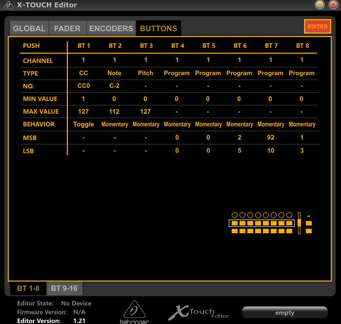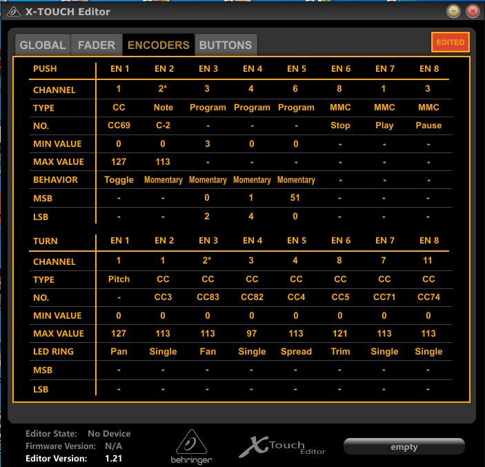 Noch genialer als das NanoPad2 ist das X touch Mini. Zusätzlich zu den Möglichkeiten des Korg Teilchens lassen sich hier für jeden Button/PushEncoder ein eigener MIDI Kanal festlegen, außerdem sind für die Program Changes LSB/MSB Befehle möglich. Diese Features sind natürlich außerordentlich sinnvoll, wenn man mit einem solchen Controller mehrere verschiedene Geräte (Synths/FXe) ansteuern will. Mir ist das konkret "aufgestoßen", als ich die Programme meines TC Helicon VoiveLiveTouch fernbedienen wollte. Die 5 Favoriten lassen sich z.B. nur unter LSB 2 ansprechen. Ist natürlich auch für alle möglichen Synths und Klangerzeuger sinnvoll, die ihre Programs unter mehr als einer Bank speichern.