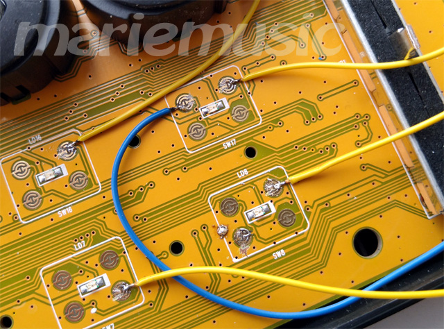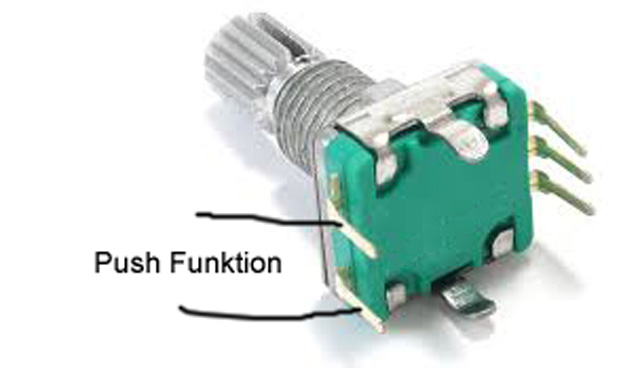 An die Kontakte der 8 Push Encoder, so man diese lieber nutzen möchte, kommt man besser heran, man erkennt sie auch sehr leicht. Das folgende Bild zeigt die beiden Pole des Tasters. Ein Kontakt ist für alle 8 Drücker der Gleiche (Plus), läßt sich einfach mit der OhmUhr ausmessen.