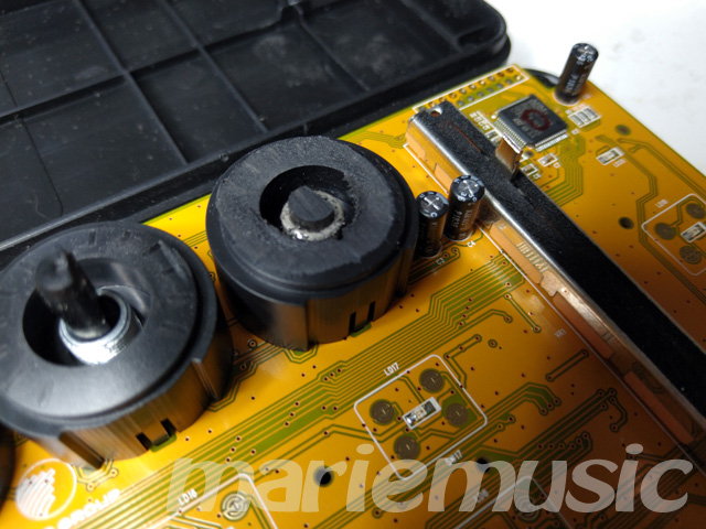 Um das Relais-Empfänger-Board aufsetzen zu können müssen die Achse des 8ten Encoders gekürzt und der Schieber des Faders abgezwickt werden.
