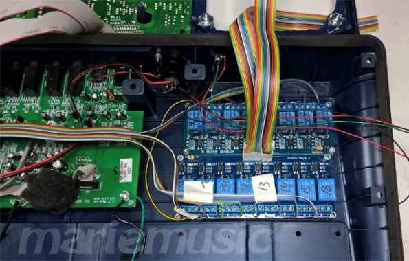 Relaisplatinen zu sehen. Die farbigen Flachbandkabel sind für den